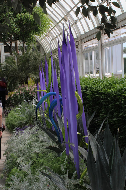 When we travel we watch for the gardens in the area the way that some people watch for shopping. We went to two Botanical Gardens while we were on the east coast. Last Saturday we went to the New York City Botanical Gardens in the Bronx. It was featuring works by the glass artist Dale Chihuly. It was great. We know his work. We have now toured 4 gardens with his sculpture over 15 years. I must say that nothing will compare with the first time at the Garfield Park Conservatory in Chicago in the early 2000s. As I think about it, that is true for so many things. I think I remember that the Garfield Park show was the first time he had tried the combination of glass art and gardens. It works.