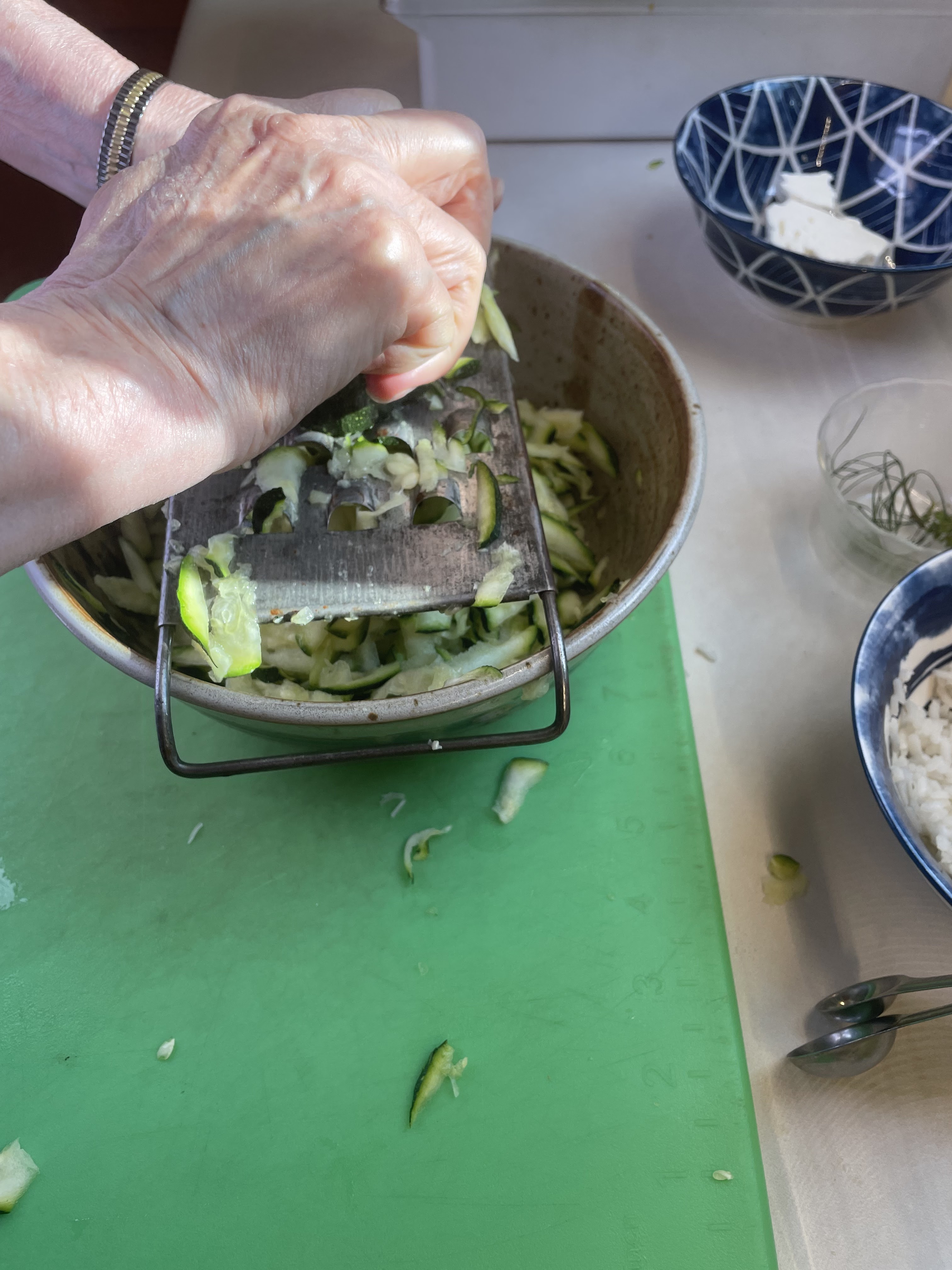 I added the cooked zucchini to the big bowl, followed by the rice, the herbs and the feta. Lastly, I added the eggs.